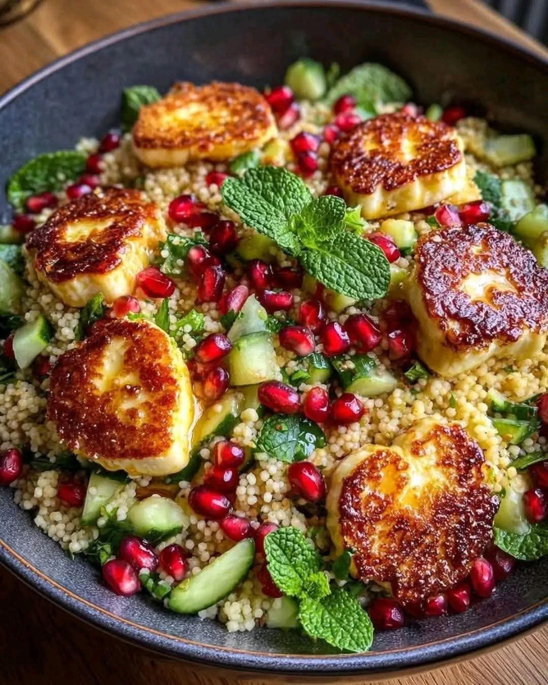# Halloumi & Pomegranate Couscous Salad with Mint-Lemon Dressing – A Burst of Flavor and Freshness